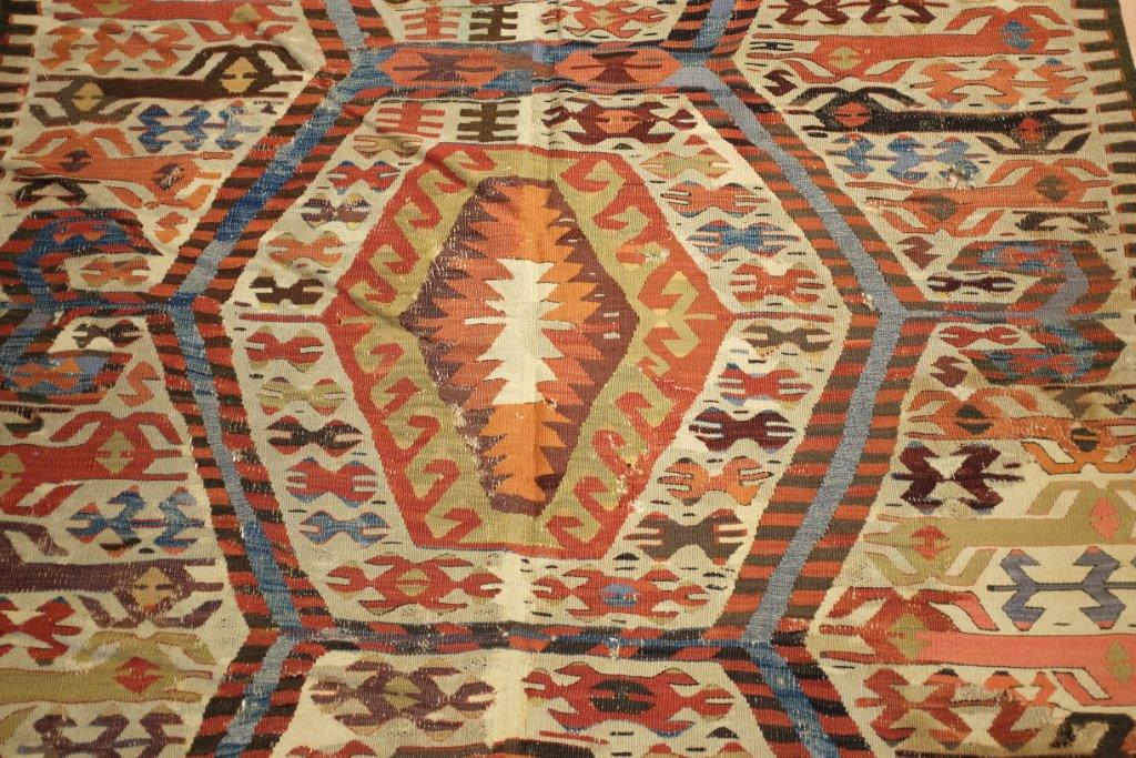 Comme ces derniers, les nomades turcs furent forcés de se sédentariser et la plupart de leurs tissages connus datent d’une période de déclin artistique et culturel- conséquence de leur appauvrissement et de leur changement de mode de vie. On trouve encore parfois un kilim ancien qui témoigne de la qualité artistique des productions d’autrefois. De longs kilims, posés horizontalement, sont encore utilisés aujourd’hui pour protéger la literie dans le fond de la tente. Celui-ci a été tissé en deux parties.