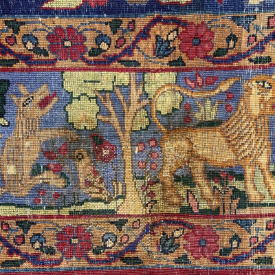 Photographies d'un tapis Kerman Perse des années 1920 Avant et Aprés. Photographie du dos, petite différence de stucture.