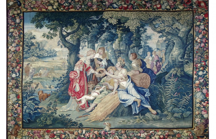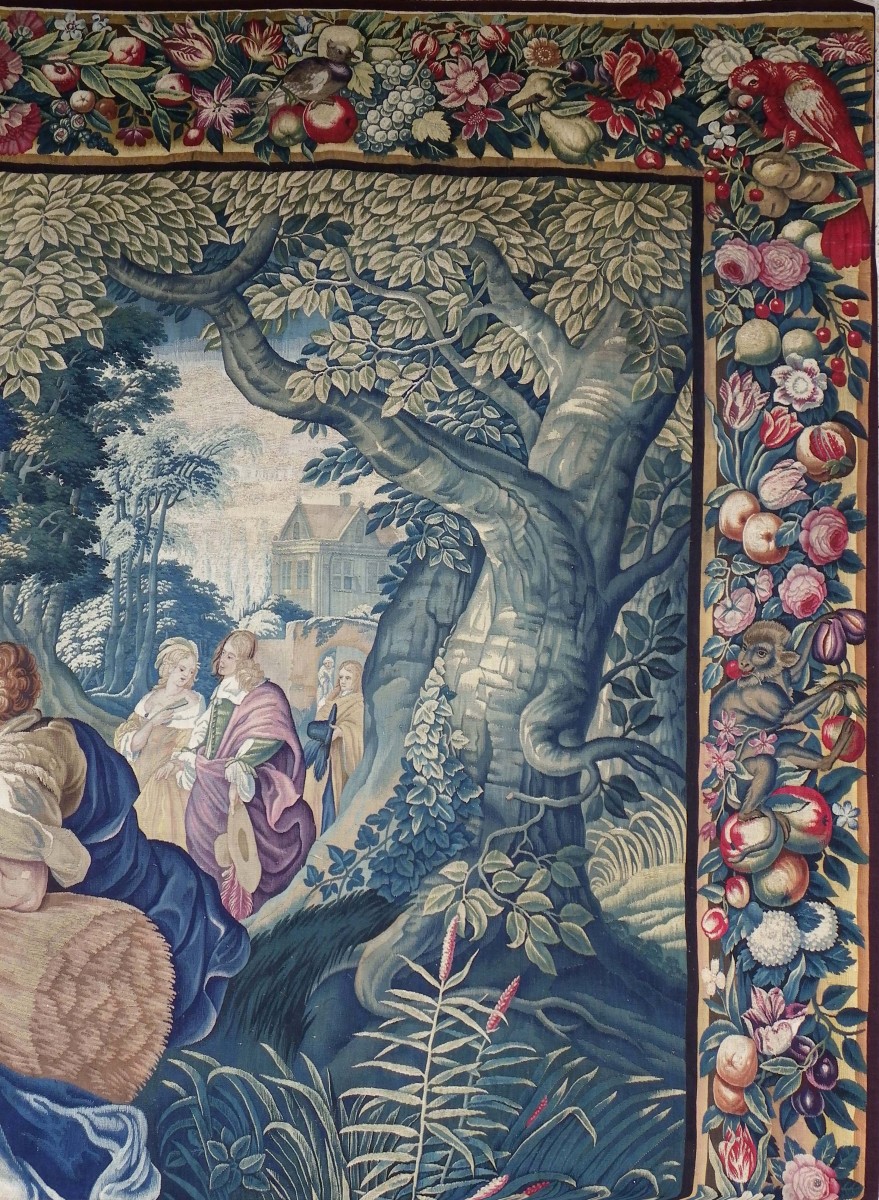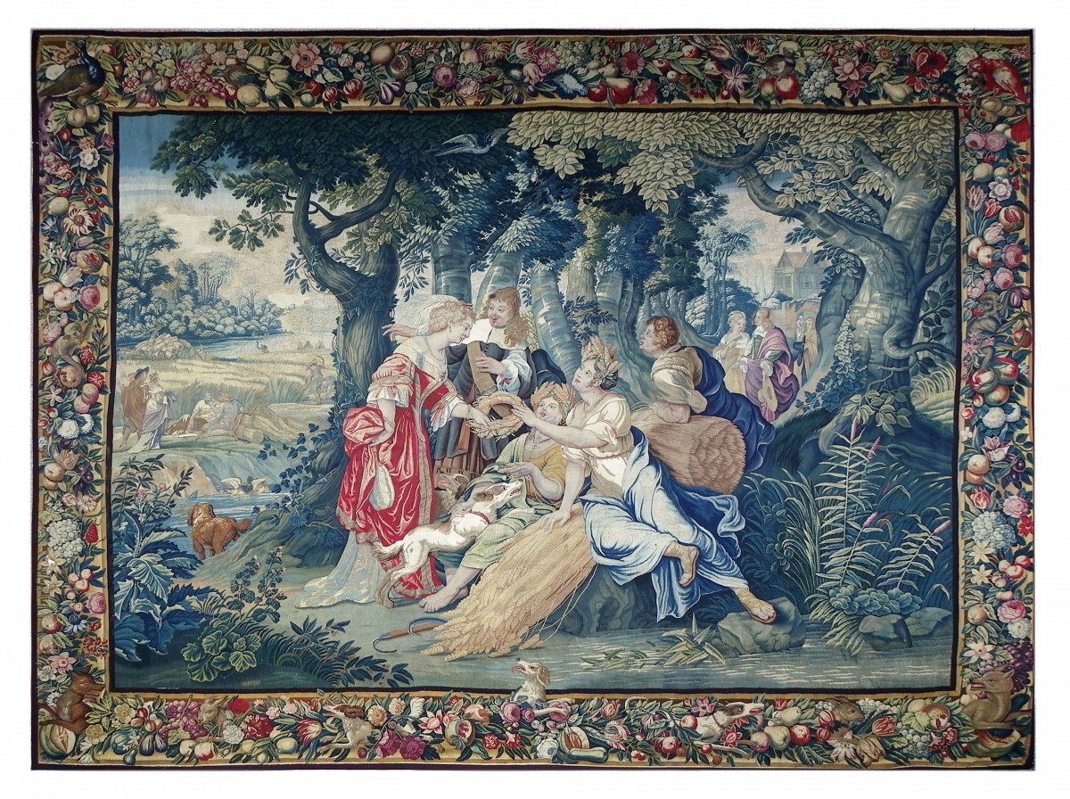 Tapisserie du XVIIe siècle, tissée à Anvers (Flandres) Les ateliers travaillaient essentiellement pour les cours et la noblesse de l'Europe. Cette Tapisserie à fait exceptionnel, conservé sa fraîcheur. Elle a pour registre l’été avec les moissons et fait partie d’une suite de tentures en quatre panneaux ayant pour thème les quatre saisons. La composition du carton nous incline à suggérer qu’il est probablement un travail de Jan Wildens (1586-1653). Une riche bordure, composée de fleurs et de fruits avec en bas en son centre un petit chien (particularité de certains ateliers anversois), vient agréablement rehaussée la grande qualité de cette tapisserie.