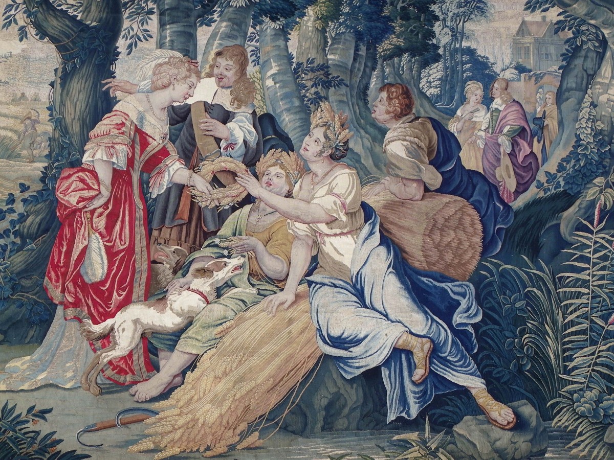 La structure de la composition des personnages suggère une double interprétation, l’une mythologique avec la Déesse Cérès (ou Déméter pour les grecs) et sa fille Proserpine (ou Perséphone pour les grecs), et l’autre plus contemporaine à l’époque de la réalisation de la tapisserie. Si la tenue vestimentaire des femmes subodore que le commanditaire, de cette tapisserie, puisse être un adepte de la rigueur exigée par l’église« Réformée », le chapeau entre les mains de l’un des personnages au second plan au centre nous invite à le croire.