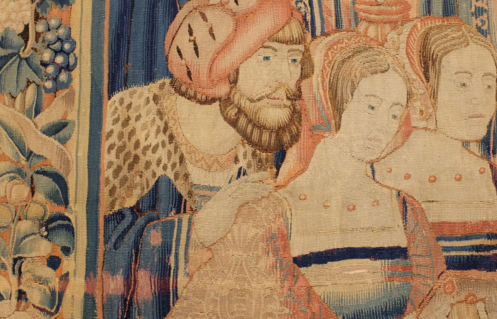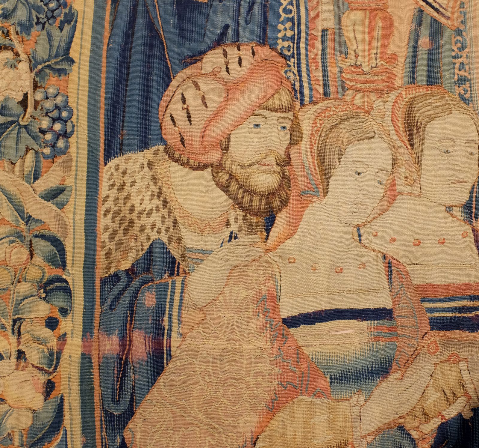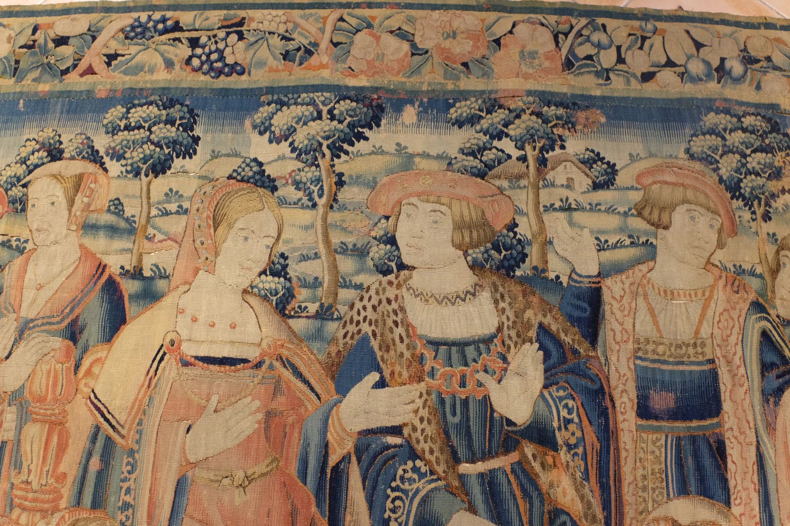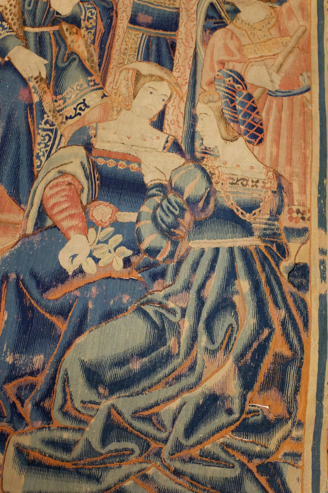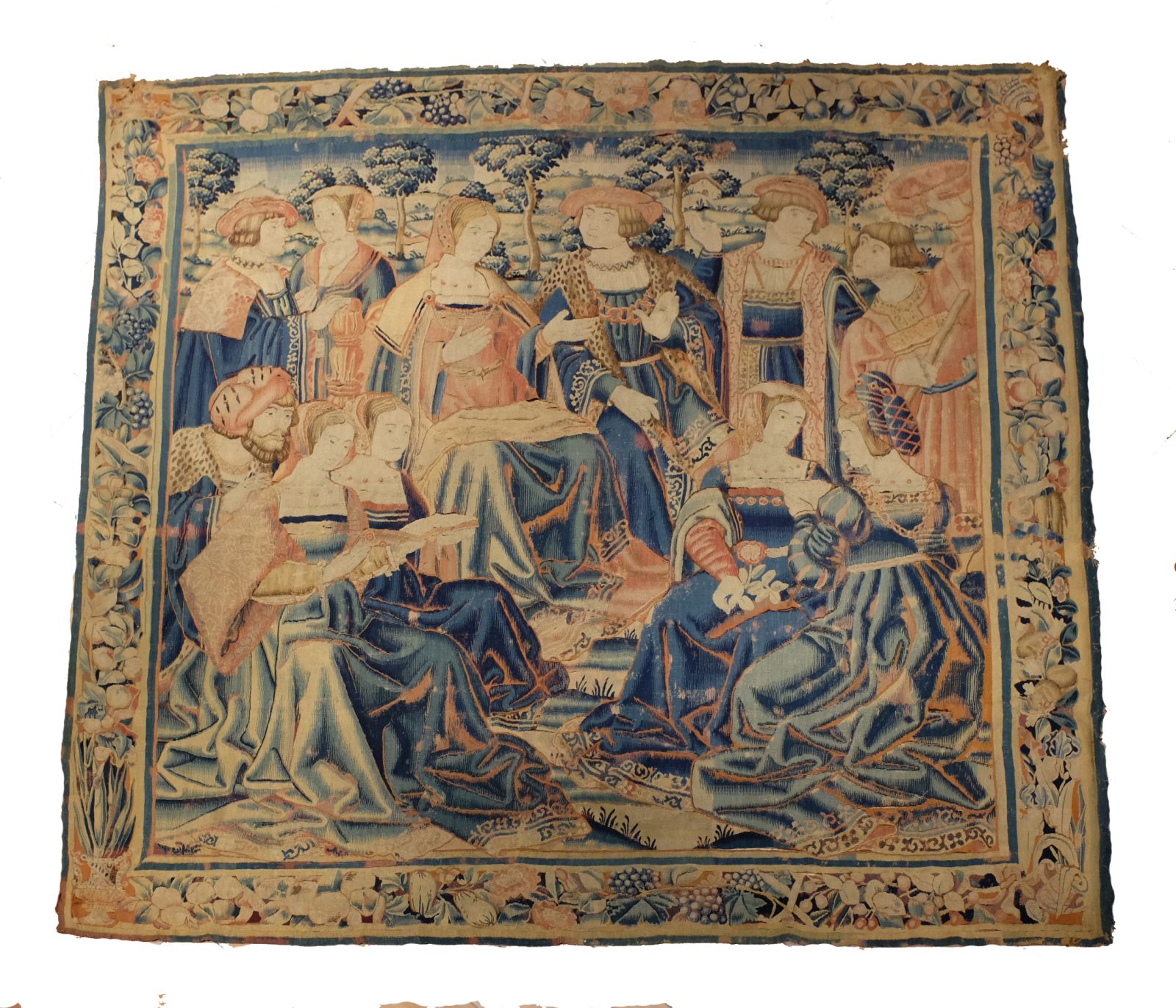 Rare tapisserie des Flandres représentant une scène de Cours. Si Bruxelles fut un centre important dans la qualité, d'autres villes des pays bas méridionaux aux XVI siècle étaient capables de tisser des tapisseries de valeur. Si nous ne pouvons avec certitude attribuer cette tapisserie à un atelier car la marque du tisserand n'était pas encore obligatoire, en la situant en Flandres par ses caractéristique de tissages et couleurs, l'origine est acquise.
